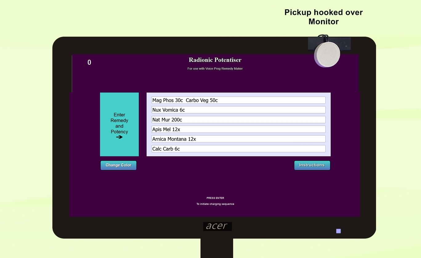 To use the software you must first attach the Transmitting Pickup to your Monitor using its built in wire hanger, then type into the screen what vibrational remedies you want, and press Enter on your keyboard, at which time those vibrations are then sent into the Temporary Memory of any Voice Programmed Remedy Maker ( or Combo Remedy maker ) that is within a distance of three feet. ( 36 inches )
